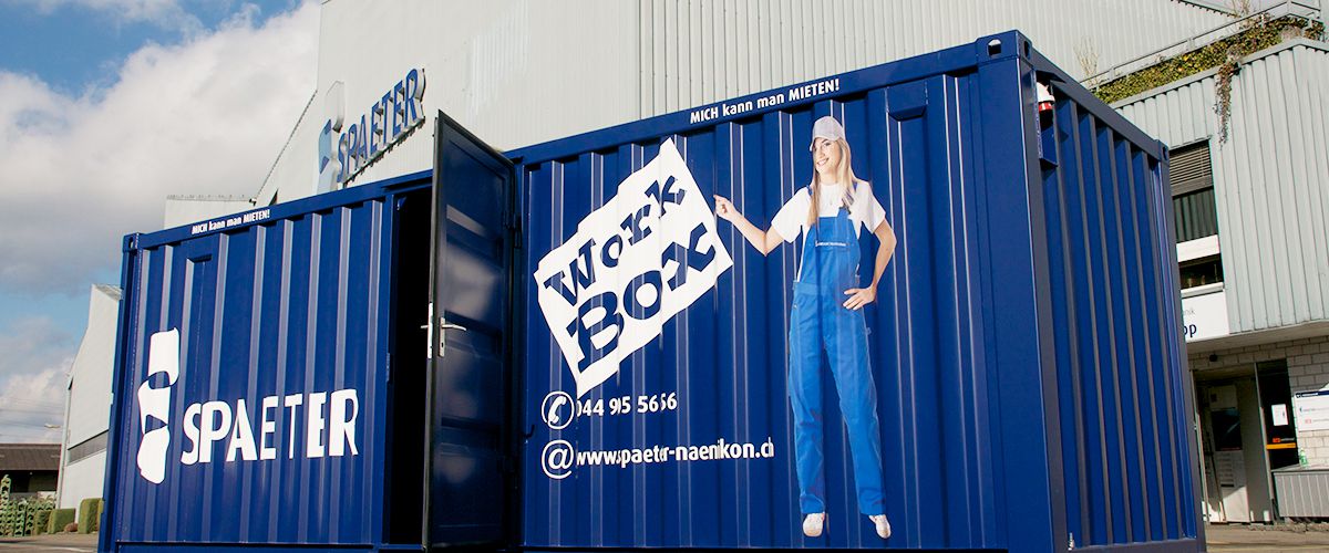 Con la Workbox Spaeter portate magazzino e officina direttamente in cantiere. Il container lungo 6,2 metri è dotato di tavolo, scaffalature, illuminazione e presa di corrente.